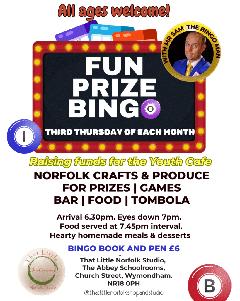 Join Mr Sam the Bingo Man for 6 games of bingo and win prizes! Lines prizes of chocolate, and gift voucher prizes for house and jackpot winners that can be redeemed in our shop or cafe. Suitable for all ages, it’s a great opportunity for all generations to have a fun night out together. Proceeds help us raise funds for our Youth Cafe!